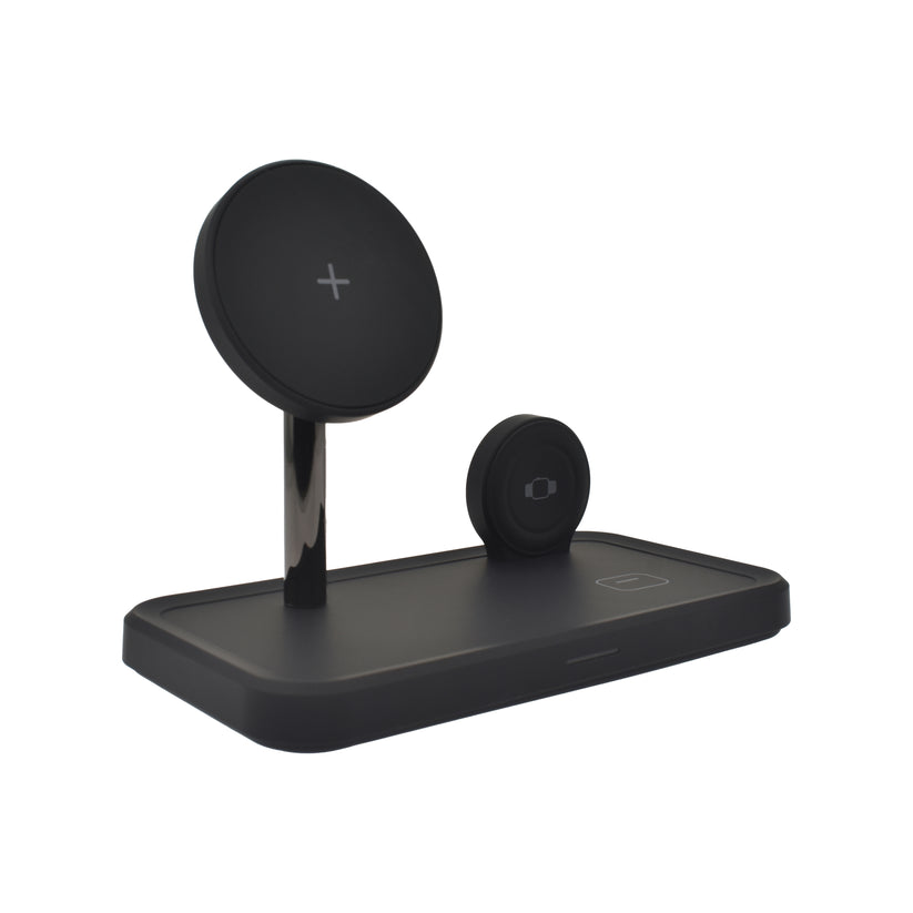 The Dviced 3-in-1 wireless magnetic charging station enables simultaneous charging of a smartphone, Apple Watch, and AirPods. Its elegant black design, durable ABS and stainless steel materials, and included USB cable make it ideal for home, office, or travel.