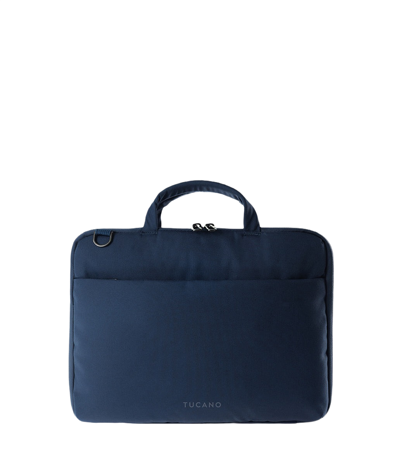 Ultra-protective slim bag made with fabric produced from recycled plastic featuring a semi-rigid back panel. The spacious interior compartment, accessible via the zipper opening on three sides of the bag, allows you to work with your device by securing the edges with the two elastic corner bands. Comes with a removable, padded shoulder strap.