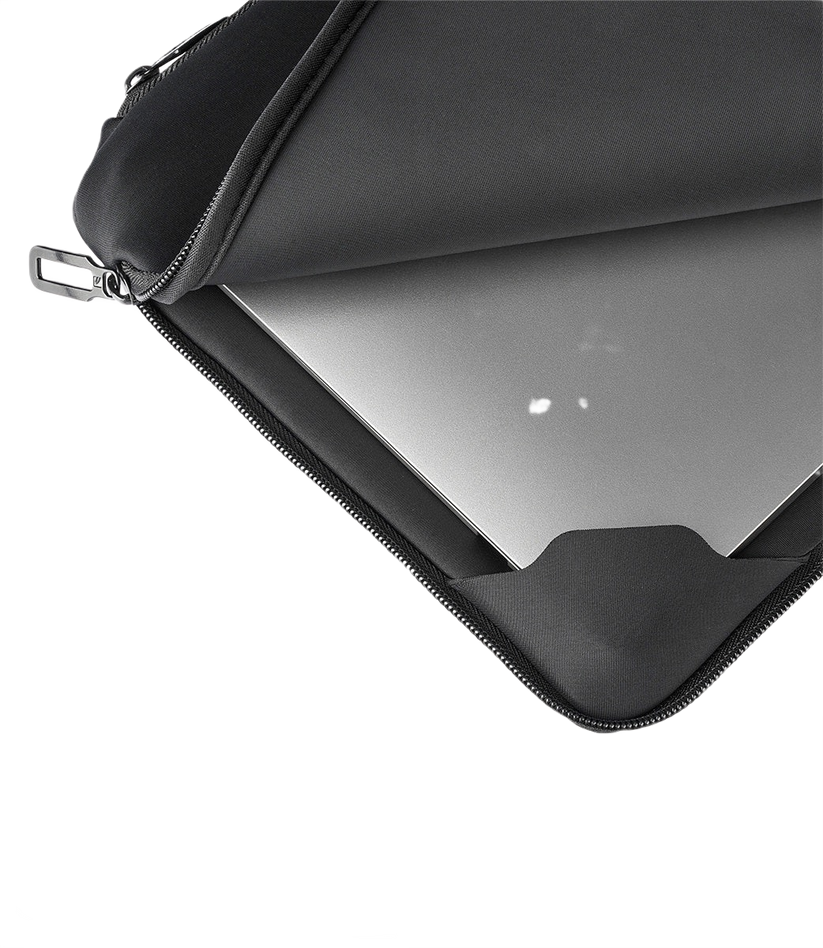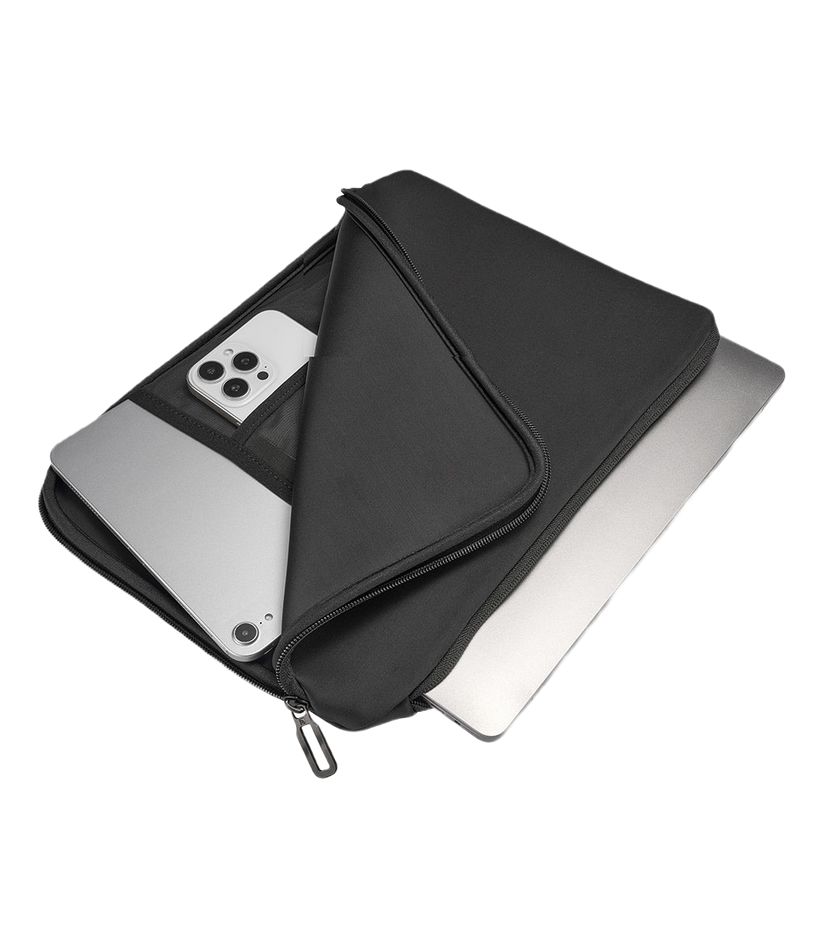Versatile sleeve with two compartments for your laptop or tablet and accessories, made from material partially sourced from recycled plastic. The main compartment includes an anti-slip system to keep your device stable, while the second features a mesh pocket for easy accessory organization. The 4mm neoprene exterior ensures great protection, and the angled inner flaps add an extra layer of safety.
